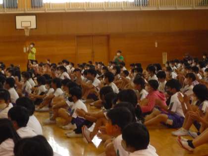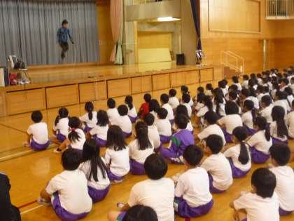 今日はなわとび小助の生山ヒジキさんを招いて、なわとび教室を行いました。ギネス世界記録を12個もお持ちのヒジキさんのなわとびパフォーマンスに子供たちは目を輝かせていました。