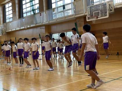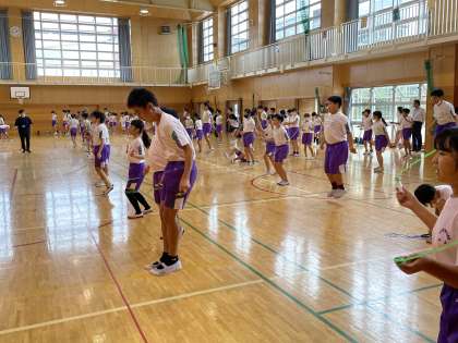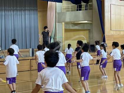 なわとび教室では、ヒジキ先生にすてきなパフォーマンスを見せていただいた後、基本的な縄の持ち方や、二重跳びの跳び方など楽しく教えていただきました。