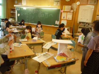 紙を折って、立てて、そこに絵を描いて、1年3組の町を作っています。