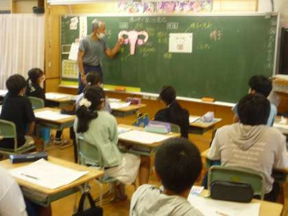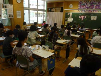 保健の授業の様子です。「体の成長」について、体育専科の先生の話を真剣に聞いていました。