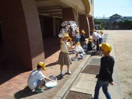 シャボン玉作りの学習では、大きなシャボン玉を作ろうと、ハンガーに毛糸を巻いたハンガーを作ってきた子供もいます。