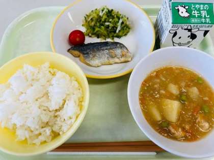 本日の献立は、ごはん、鰆の西京焼き、華風和え、ミニトマト、じゃがいものそぼろ煮、牛乳です。