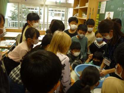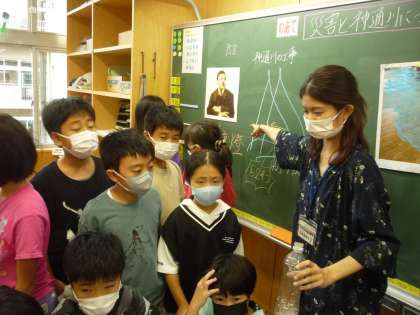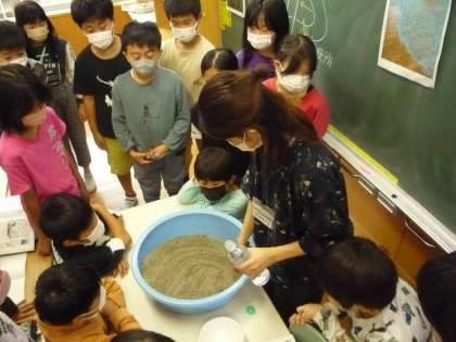 昔、神通川が多くの水害があったわけを実験しています。曲がりくねった川が、崩れてしまうことに驚いています。