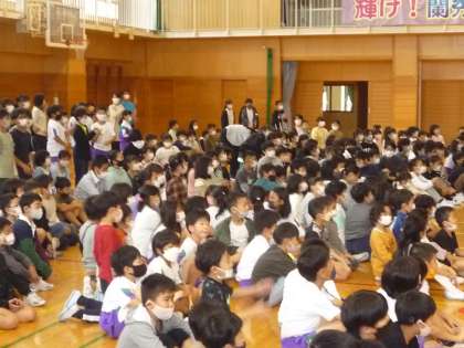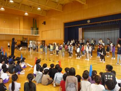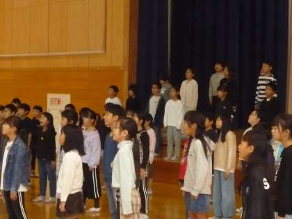 4年生が体育館でゲリラライブを行いました。来週月曜に行われる区域音楽会で歌う曲を披露しました。