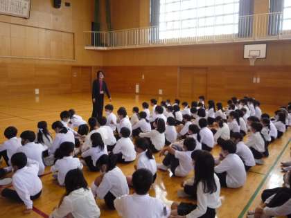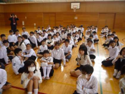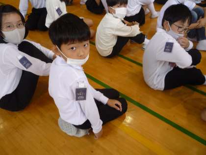 今日はいよいよ区域音楽会です。最後の練習で気持ちを高めています。右肩には目当て「つなぐ」のワッペンを貼って臨みます。最後に満面の笑顔で、今日の気持ちを表してくれました。