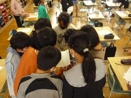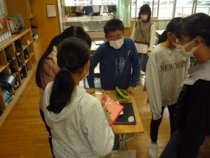遠近感のある絵を描きました。友達のよいところを鑑賞し合っています。