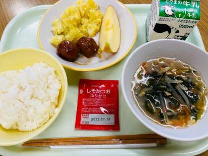 本日の献立は、ごはん、ミートボール、チーズおさつ、春雨スープ、りんご、しそかつおふりかけ。牛乳 です。
