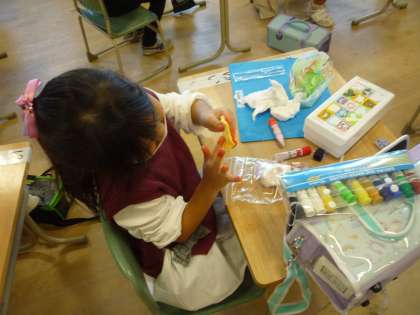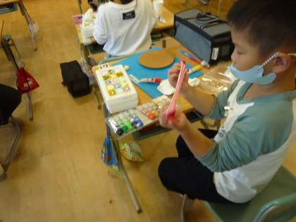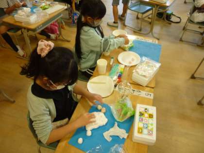 紙粘土に色を混ぜ、ごちそうを作っています。