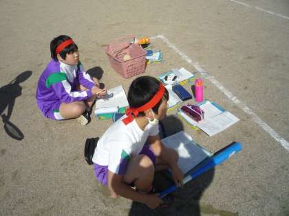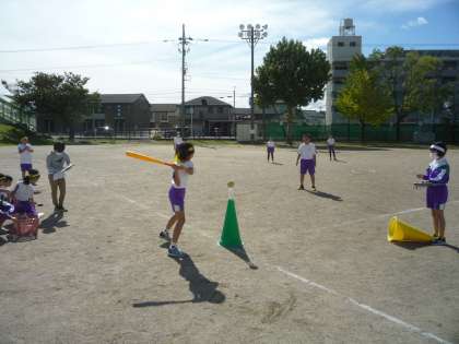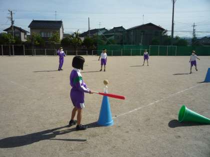ベースボール型のゲームに挑戦しています。ティーに置いたボールを打つのが難しそうです。記録もしっかり取っています。