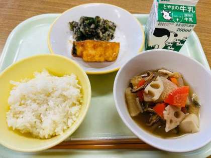 本日の献立は、ごはん、揚げ魚のレモン味、よごし、根菜、牛乳 です。