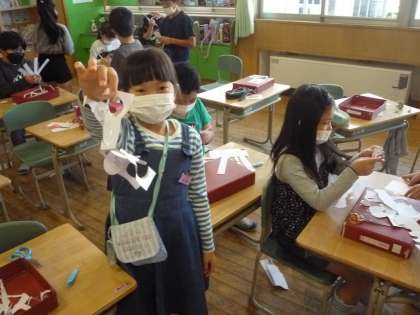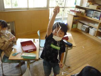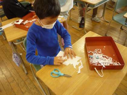 はさみを上手に使って、ぐるぐると長くなるように切りました。