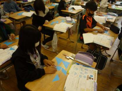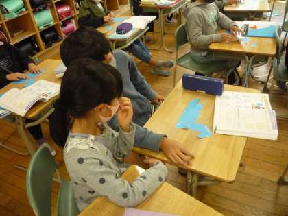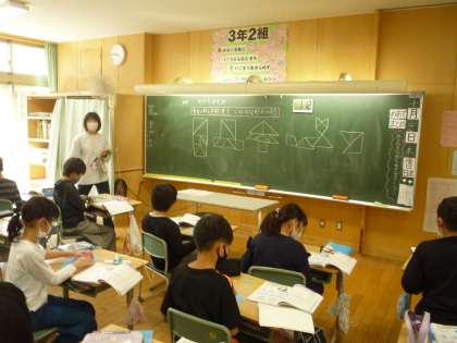 図形の学習です。提示された図を三角形や四角形を使って形作っています。