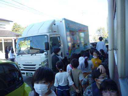 「こんなトラックあったらいいな」小学生絵画コンクールで優秀賞の作品がラッピングされたトラックを見学しました。ちなみに、山室小学校児童の作品もラッピングされています。