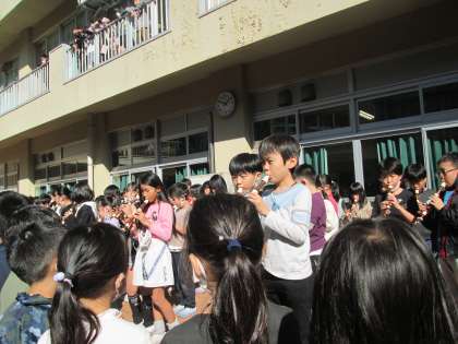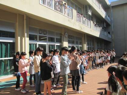 3年生は、学校を楽しくしようと、らんしゅうタイムに中庭でリコーダーの演奏会をしました。