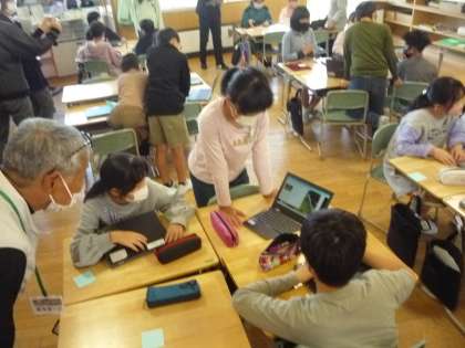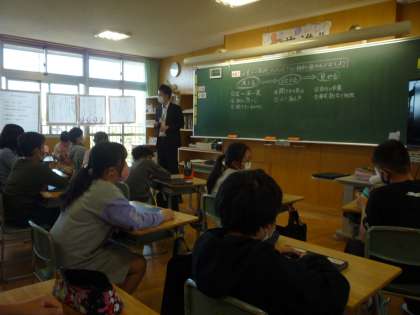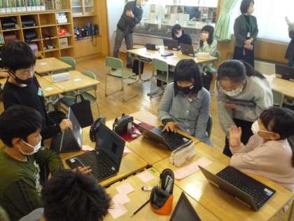 5年生の総合的な学習の時間を参観し、校内研修会を行います。子供たちは中庭よくするための企画をプレゼンします。今日はグループの友達からアドバイスをもらい、修正や練習を行いました。