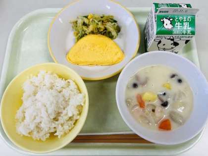 本日の献立は、ごはん、オムレツ、アスパラサラダ、秋の香りシチュー、牛乳 です。