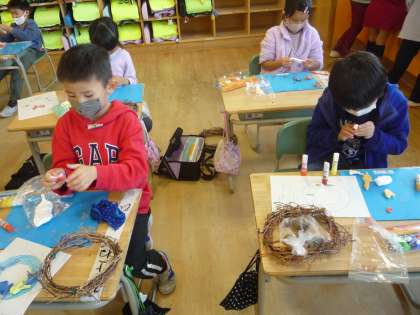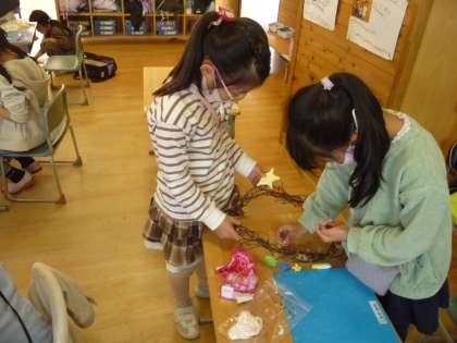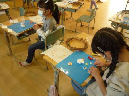 アサガオの蔓で作ったリースに飾りを付けます。その飾りを紙粘土で作っています。