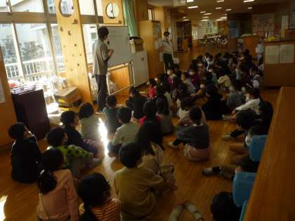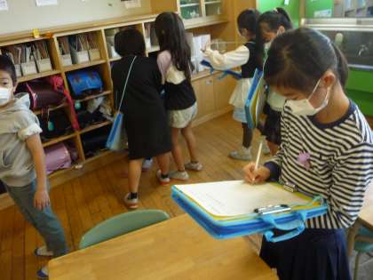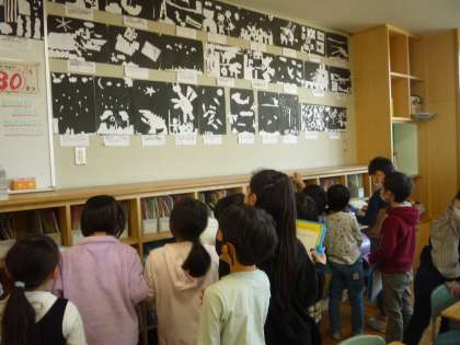 はさみを上手に使って、切り絵を作りました。その友達の作品をみんなで鑑賞します。