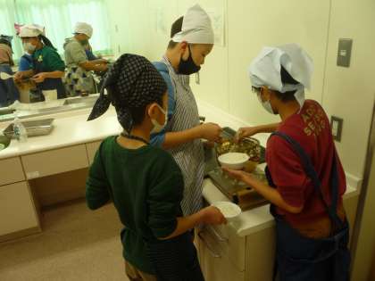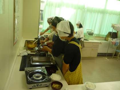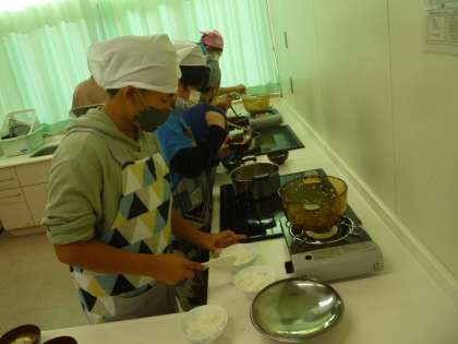 ご飯とみそ汁を作りました。みそ汁の具は、とうふになめこ、大根、ねぎと具だくさんです。
