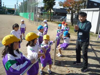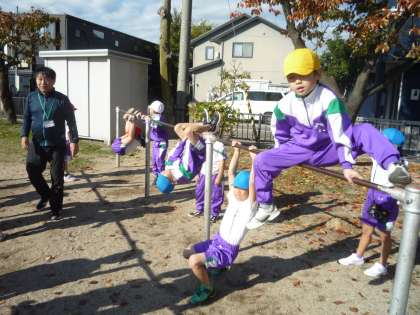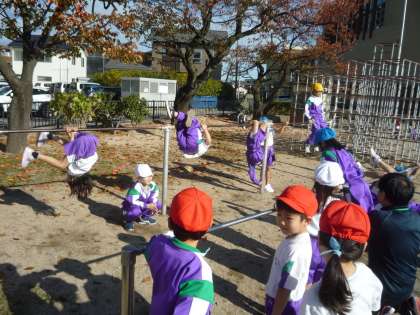 鉄棒遊びに取り組んでいます。ツバメやコウモリ、地球周り等に挑戦しています。先生に褒めてもらい、大喜びです。