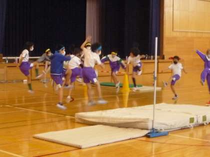 走り高跳びに挑戦しています。先ずは、3歩のリズムや振り上げ足の練習をしました。