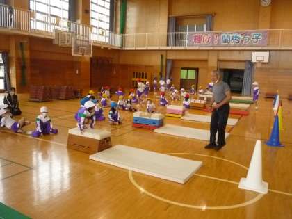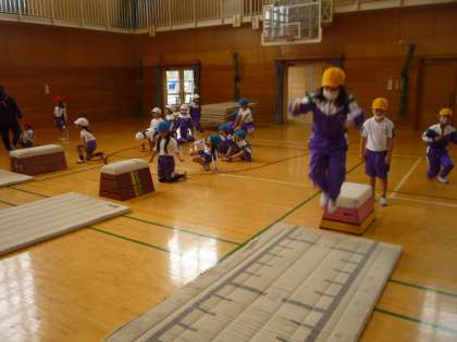 跳び箱遊びに挑戦しました。跳び箱に跳び乗ったり、飛び降りたりして楽しんでいます。