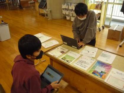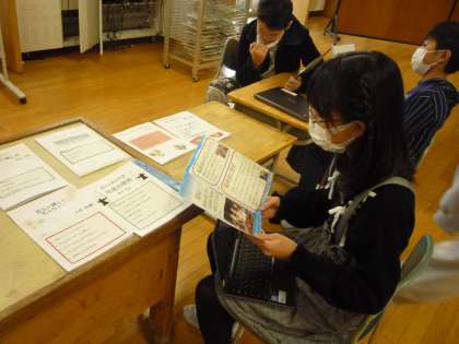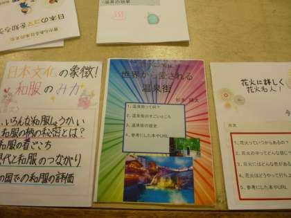 日本の伝統文化を伝えるためのパンフレットを作成しました。友達のパンフレットを見合いました。