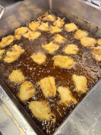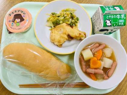 本日の献立は、コッペパン、豚肉のフリッターまたはえびフライ、アスパラサラダ、ポトフ、お米のタルトまたはチョコプリン、牛乳 です。