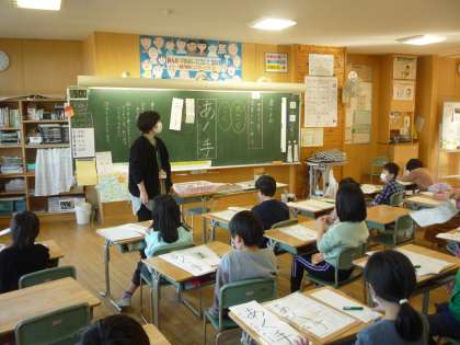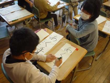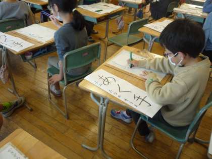 書き初めの練習をしました。落ち着いて、丁寧に書いています。
