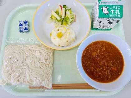 本日の献立は、ソフト麺のミートソースかけ、白菜とりんごのサラダ、蒸しパン、ポケットチーズ、牛乳 です。