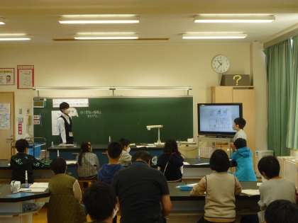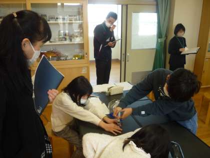 注射器に水と空気を入れて押したときの、体積の変化や手応えを調べました。子供たちの学習の様子を参観し、研修します。