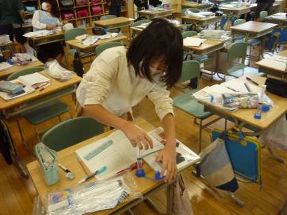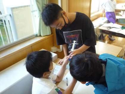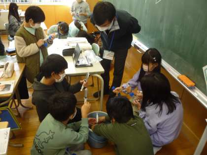 注射器の中に水を入れて、押したときの手応えや体積の変化を調べています。