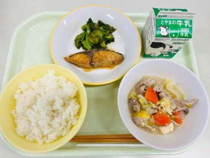本日の給食は、ごはん、ふくらぎのみぞれかけ、とろろ昆布和え、白菜鍋、牛乳 です。