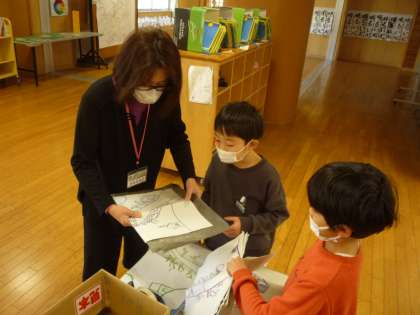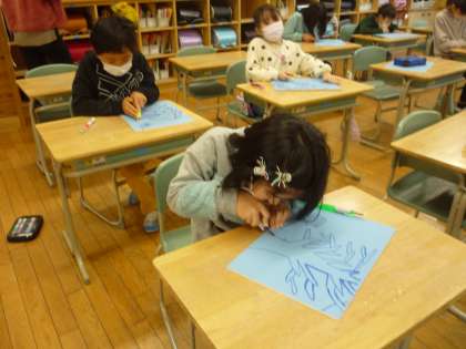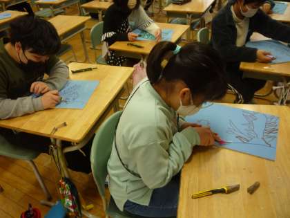 彫刻刀を使って、版画に挑戦します。正しい彫刻刀の使い方を学びました。