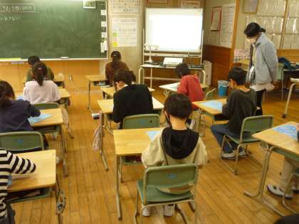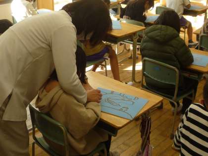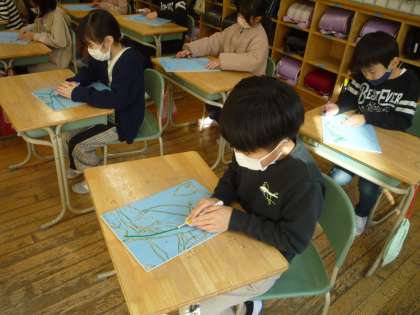 初めての彫刻刀に挑戦です。安全に気を付けて、線を彫っています。