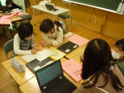 学習発表会で、今まで学習したことをどのように発表すればよいか、グループで考えています。