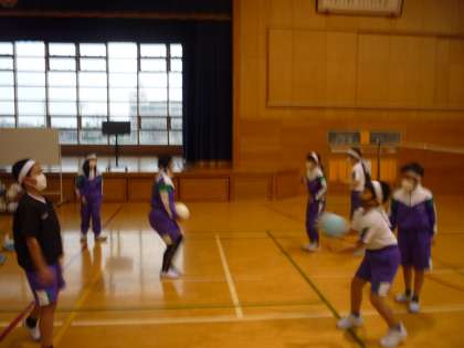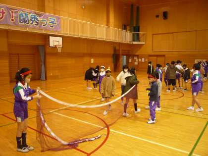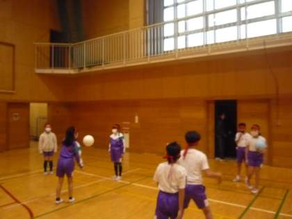 キャッチバレーボールに挑戦しています。ネットの準備や練習をグループで協力して行っています。