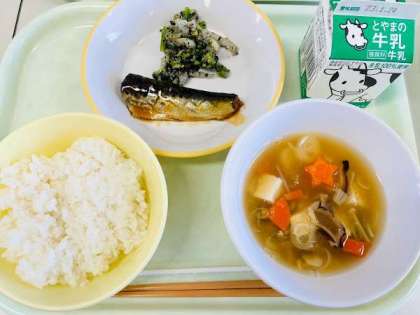 本日の給食は、ごはん、いわしの梅煮、よごし、すいとん、牛乳 です。