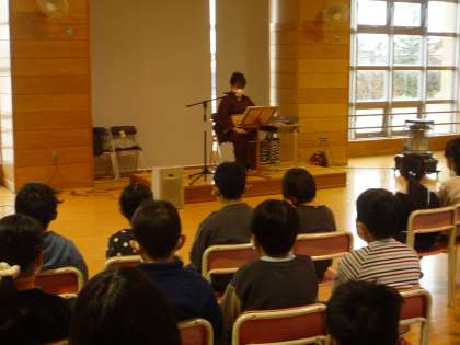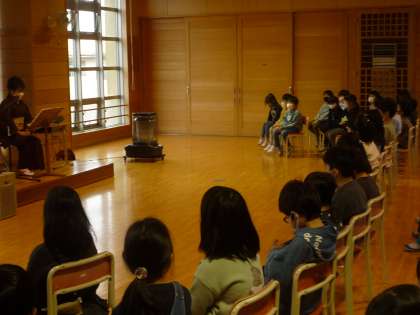 本物と触れる取組の一つ、朗読家の鈴木優子先生を招いて「朗読会」を行いました。今日は低学年でした。教科書にある「たぬきの糸車」や「スイミー」等もあり、目を輝かせて聴いていました。