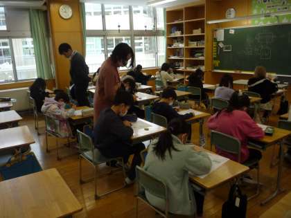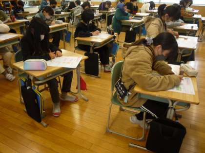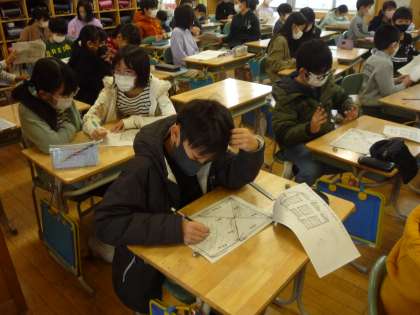 面積を求める問題に挑戦しています。習熟度別のあるクラスでは、自分たちで難しい問題を作り合い、その問題に挑戦していました。