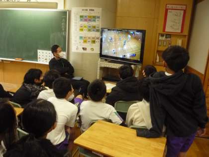 録画したゲームの様子を見て、自分たちの動きを振り返ったり、作戦を考えたりしています。