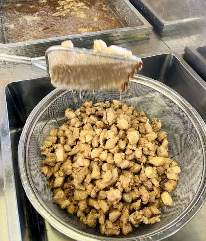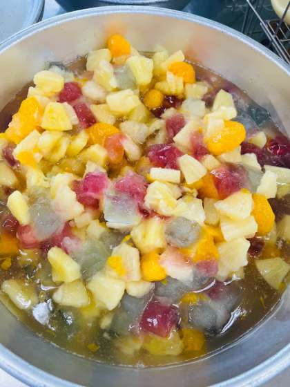 ガラスの靴のキラキラした様子を表現した「ガラスのカクテル」はシロップの中にフルーツとゼリーを加えました。豚肉のハニーマスタードかけは一度でんぷんで揚げてから、ソースをからめました。ジューシーでとても美味しかったです。