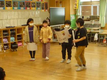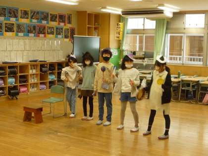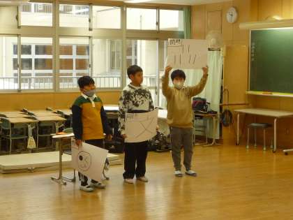 社会や理科、音楽、体育等で、できるようになったことをそれぞれの班に分かれて発表しています。