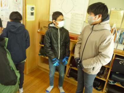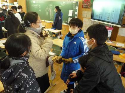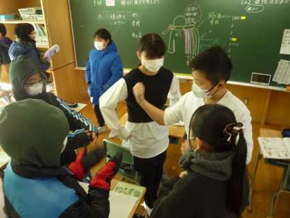 オーバー等の暖かい着方について学習しています。今日の暖かく着た工夫を友達に説明しています。