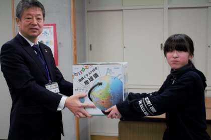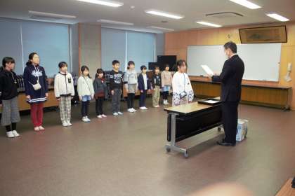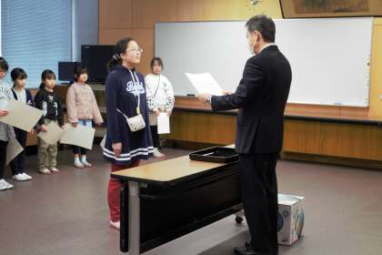 手紙作文コンクールや防火ポスター等の受賞伝達を行いました。PTA主催の山室小学校ロゴ募集いおいて、最優秀賞を受賞した児童には、地球儀が贈呈されました。