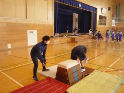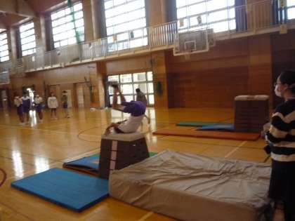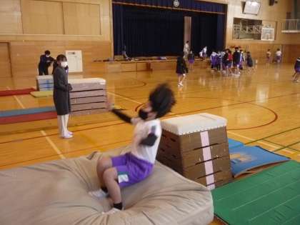 跳び箱運動の学習では、台上前転や台上ヘッドスプリング等の難しい技にも挑戦しています。