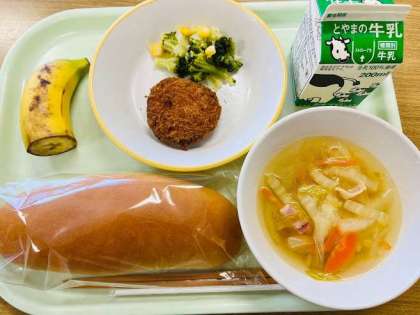 本日の献立は、コッペパン、メンチカツ、ブロッコリーサラダ、白菜スープ、バナナ、牛乳 です。