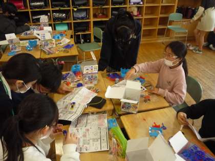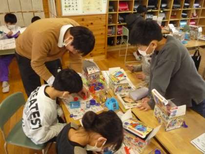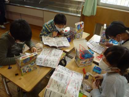 電磁石の学習では、説明書を見ながら実験に取り組んでいます。声をかけると、電線を巻いた数が分からなくなったと言われてしまいました。