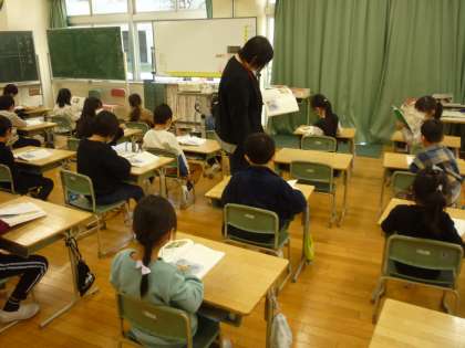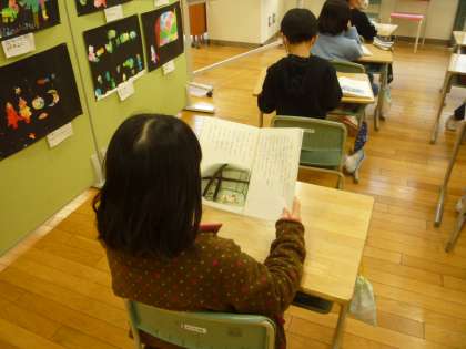「たぬきの糸車」の学習では、たぬきやおかみさんの気持ちを考えながら音読しています。