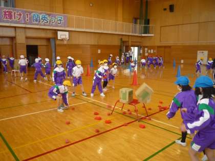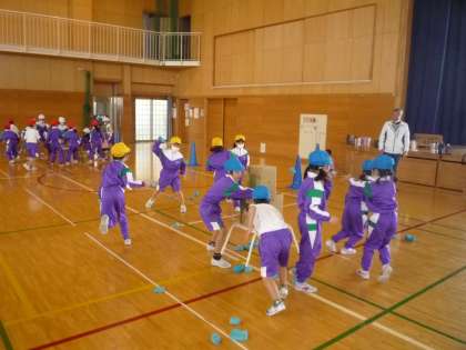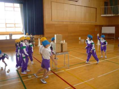 玉入れの球で、段ボール箱を落とし合うゲームをしました。力強い球を投げないと箱は落ちません。